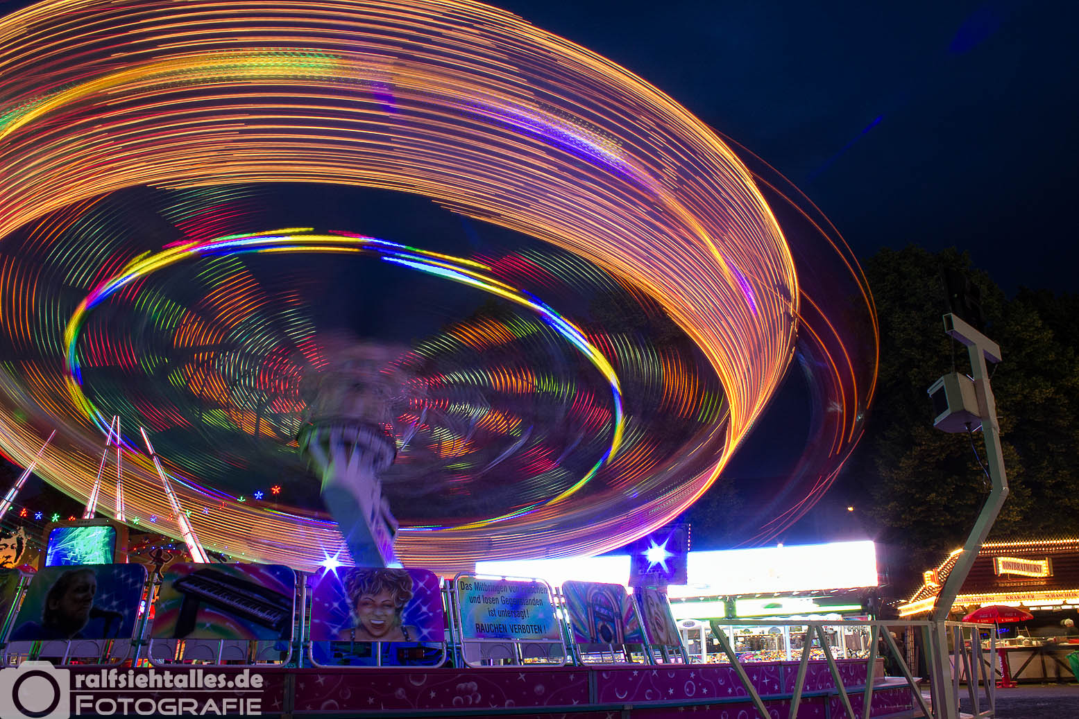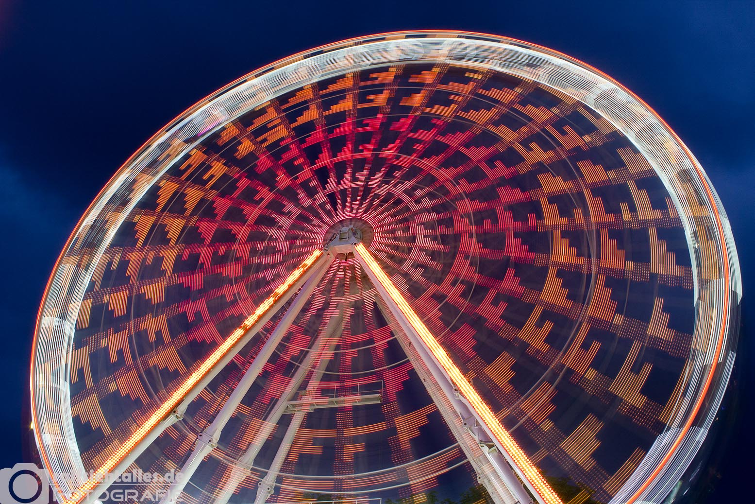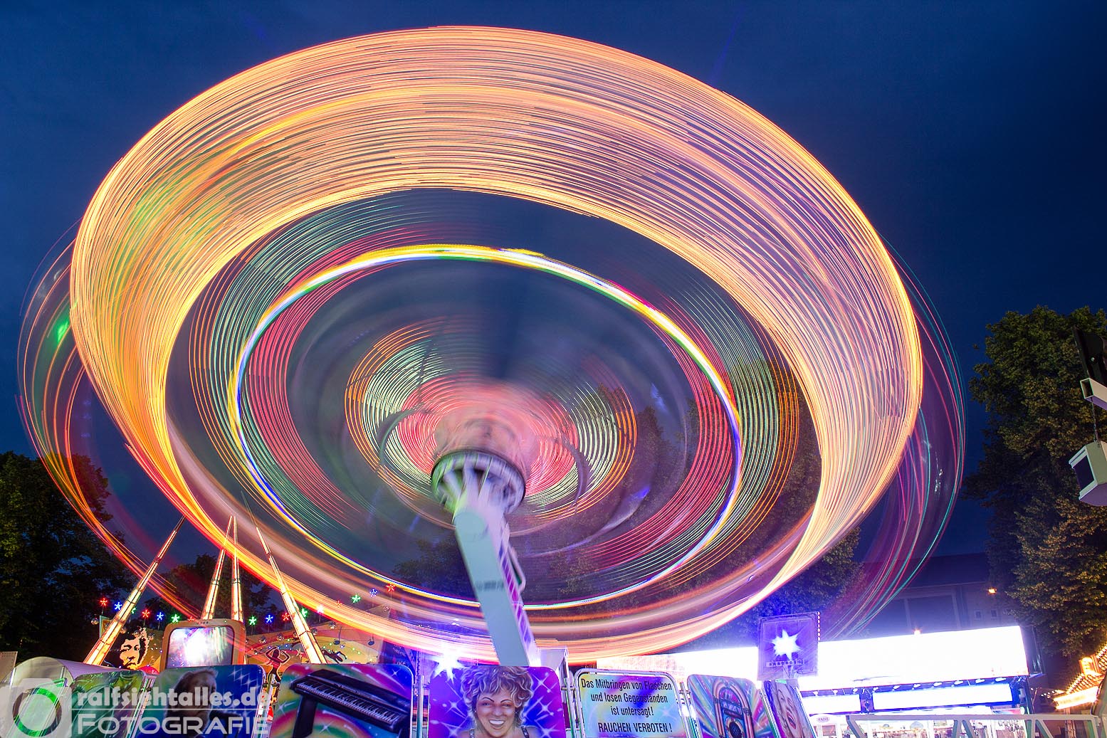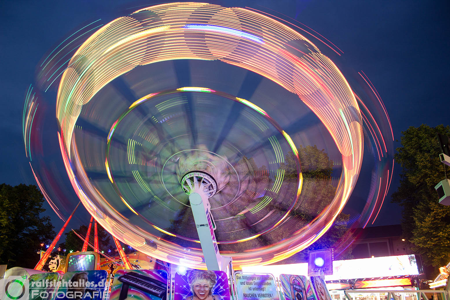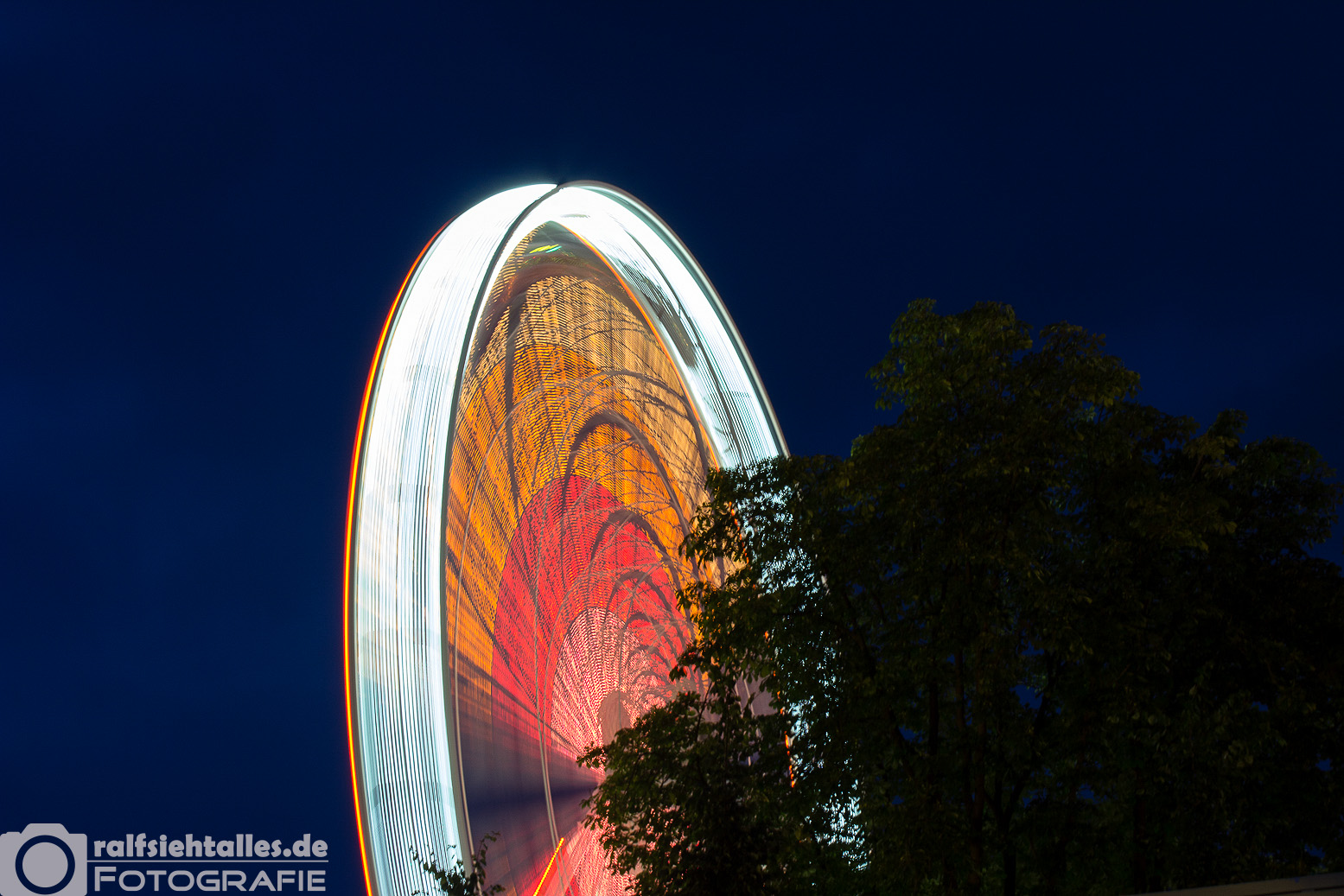 Der Send in Münster ist immer ein Ereignis, dass viele Menschen aus den Schlossplatz zieht. Die vielen bewegten und beleuchteten Karussells bieten eine gute Gelegenheit für ein paar Lichtzieheraufnahmen. Und aus dem Riesenrad lassen sich hervorragende Aufnahmen von der Stadt machen.