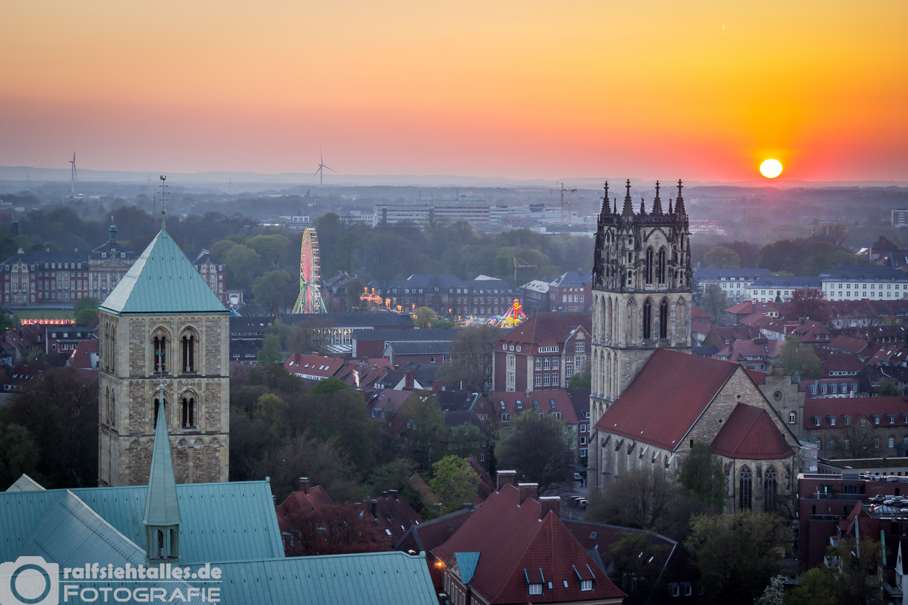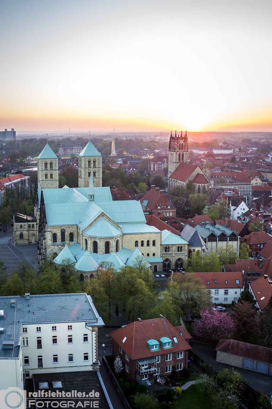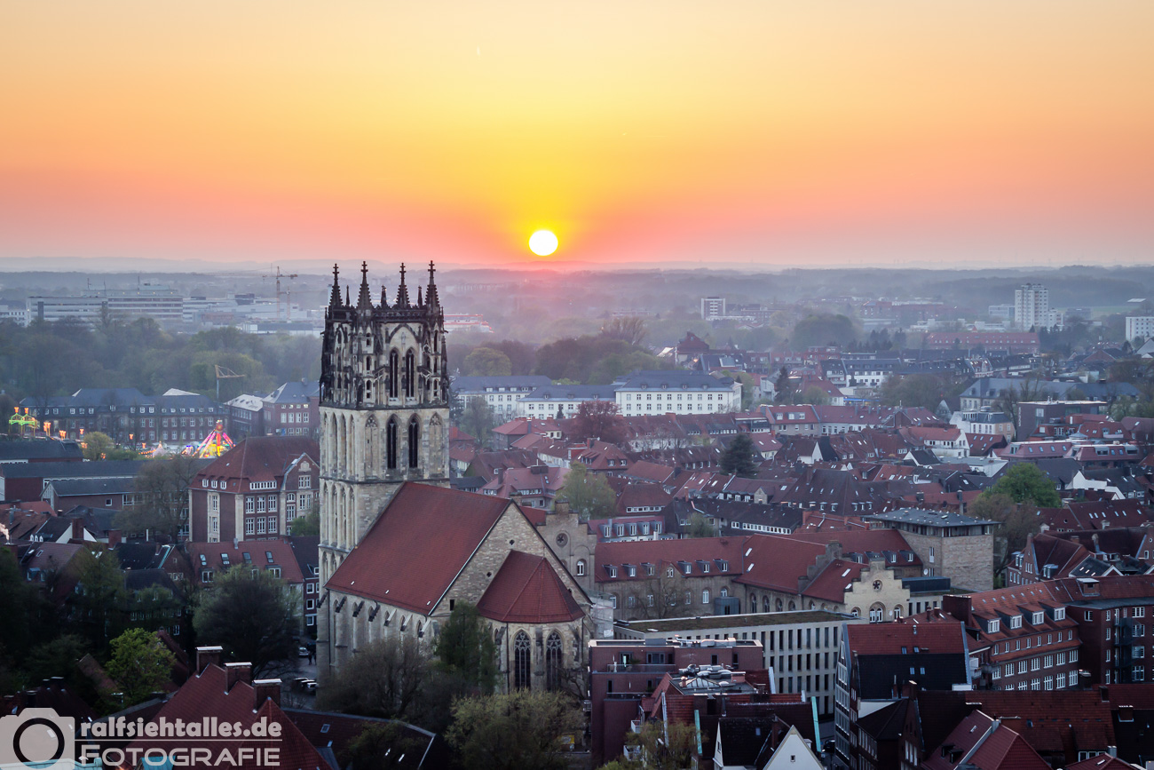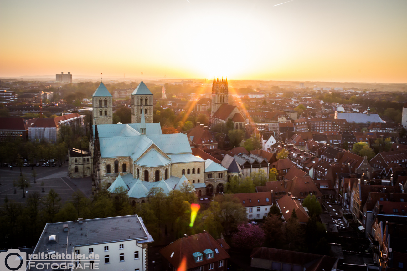 - Die letzten Sonnenstrahlen treffen die Dächer von Münster.