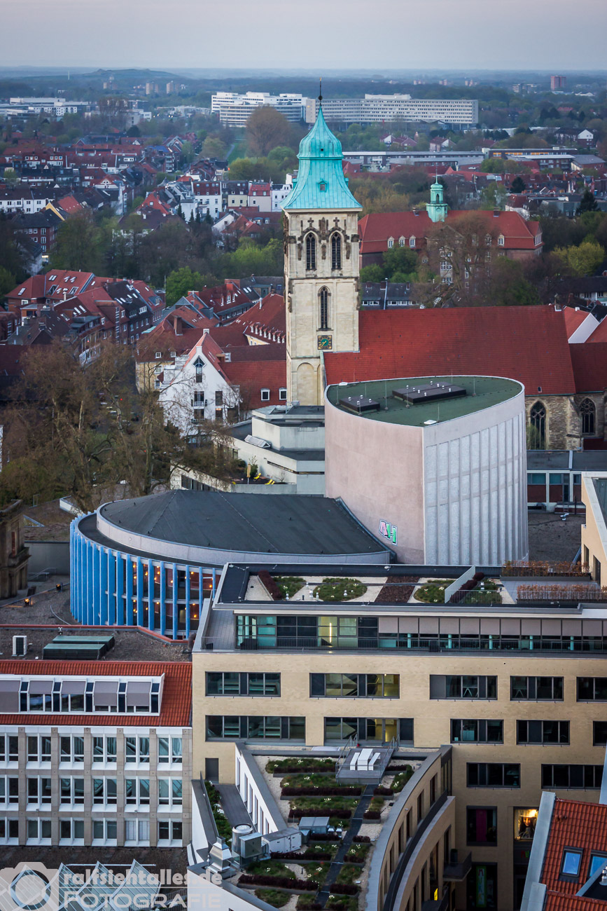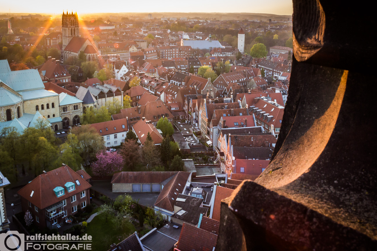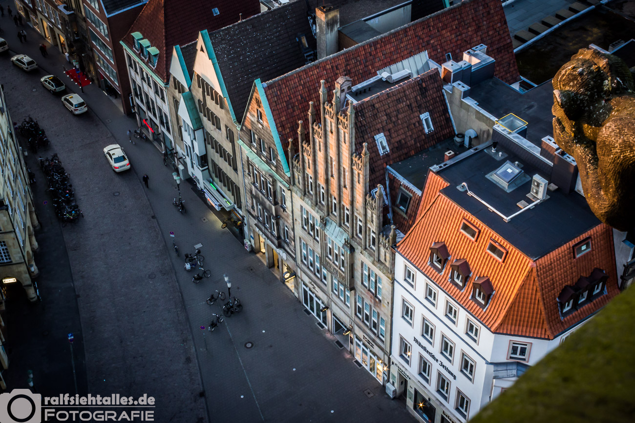 Zugegeben, der Aufstieg auf den Lambetiturm ist alles andere als ein Kinderspiel. Ein sehr enges und recht niedriges Treppenhaus, dass sich scheinbar unendlich nach oben windet. Aber der Aufstieg lohnt sich! Oben angekommen, hat man einen grandiosen Blick über Münster. Schaut man hinab auf den Prinzipalmarkt, lässt sich nur erahnen wie geschäftig es da unten zugeht. Alles erscheint einem weit entfernt und fast unwirklich. Wenn man sich etwas Zeit nimmt, sieht man Ecken und gewinnt Einblicke von Münster, die einem von unten verborgen bleiben.