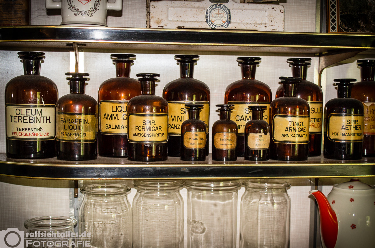 - Das Regal mit den Apothekerflaschen.